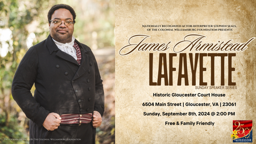 Back to All Events James Armistead Lafayette - Second Sunday Series Sunday, September 8, 2024 2:00 PM 3:00 PM 6504 Main Street Gloucester, VA, 23061 United States (map) Google Calendar ICS